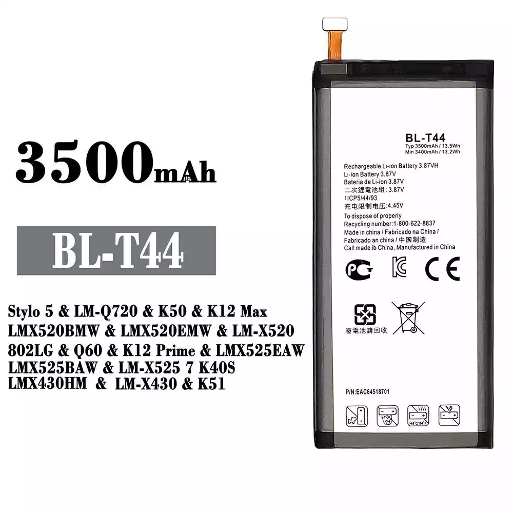 Akku BL-T44 für LG Stylo 5 / LM-Q720 / K50 / K12 Max / LMX520BMW / LMX520EMW / LM-X520 / 802LG / Q60 / K12 Prime / LMX525EAW / LMX525BAW / LM-X525 7 K40S / LMX430HM / LM-X430 / K51